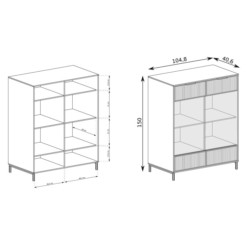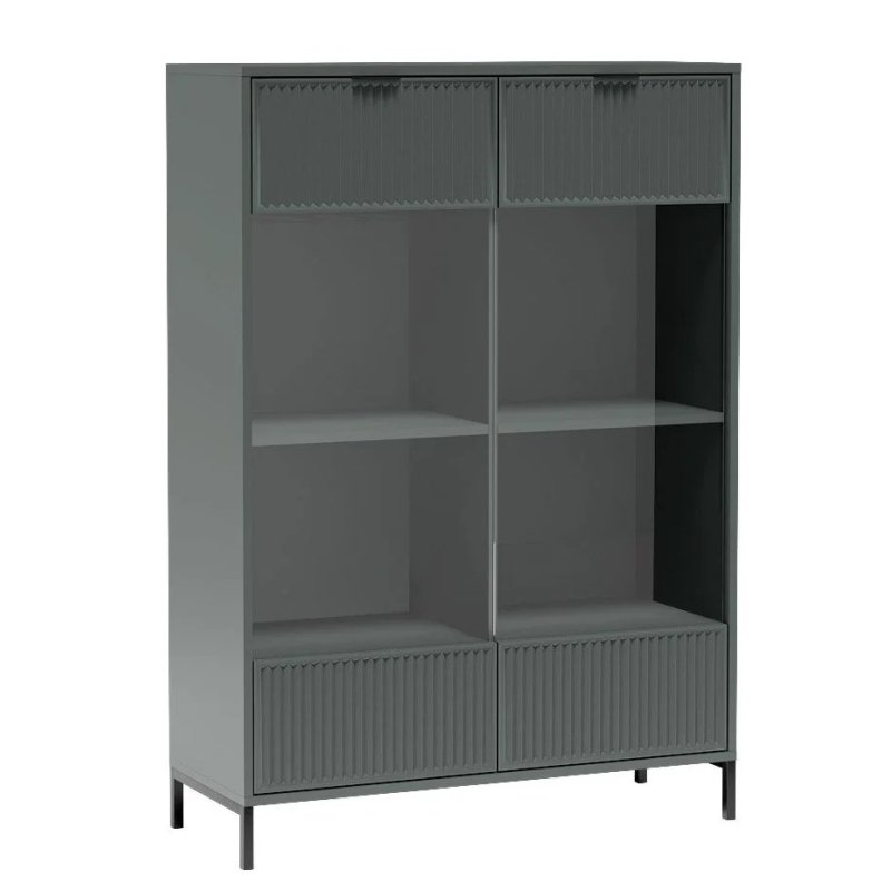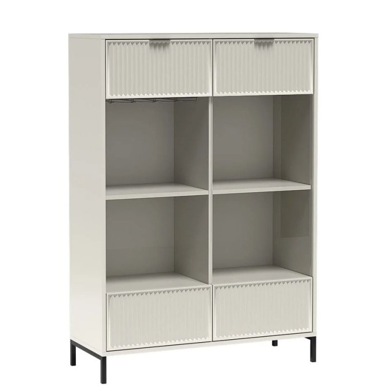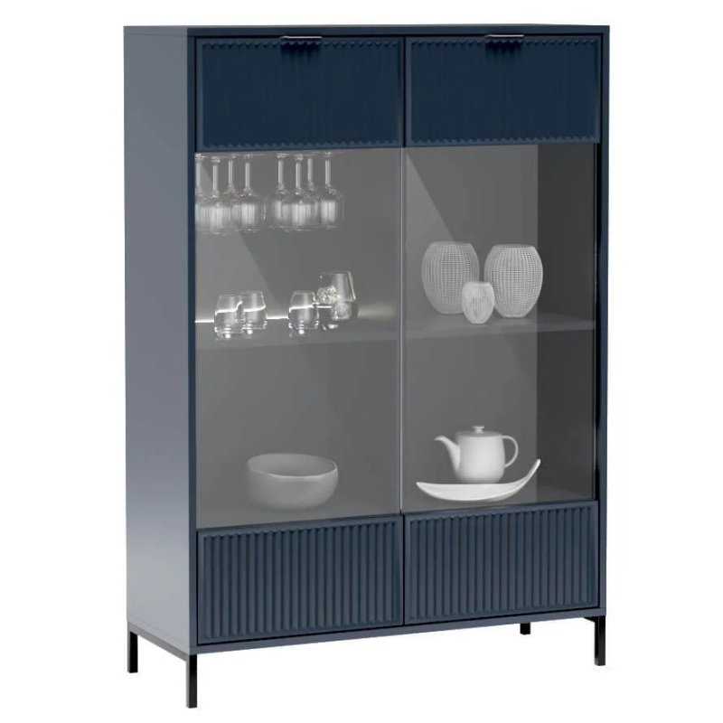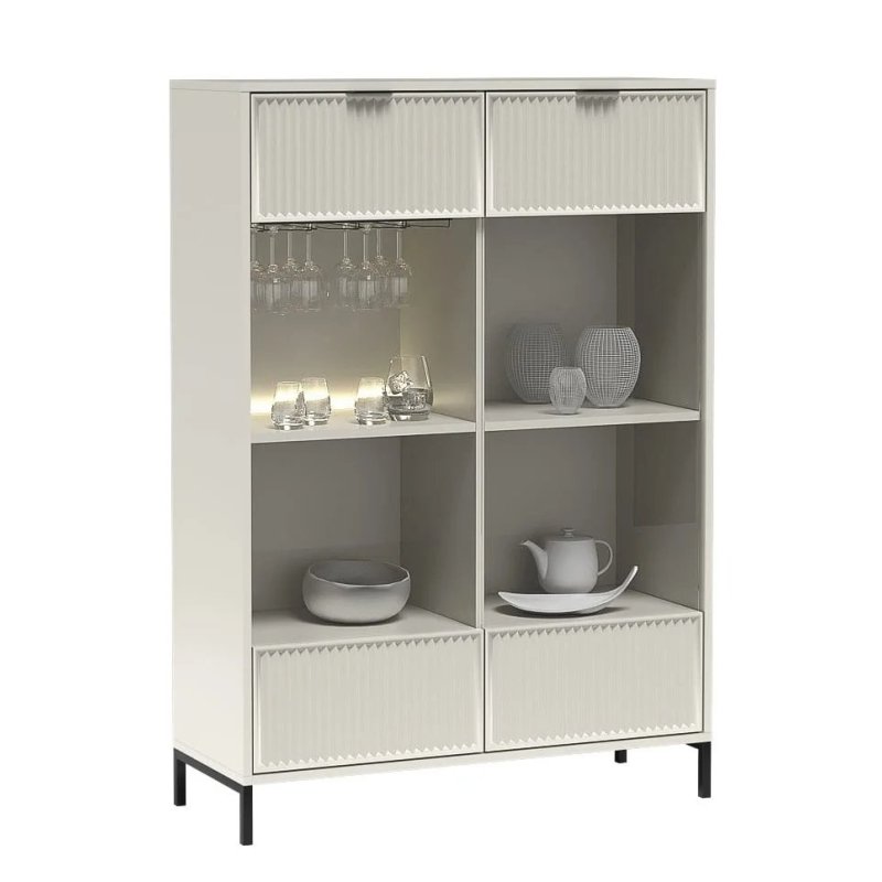 Witryna wyposażona jest w 4-rzędowy uchwyt na kieliszki do wina oraz oświetlenie LED, które subtelnie podkreśla wyeksponowane przedmioty – od serwisu obiadowego po kryształowy wazon. Elegancji dodają ryflowane fronty w połączeniu ze szkłem, które tworzą wyjątkowy efekt wizualny.