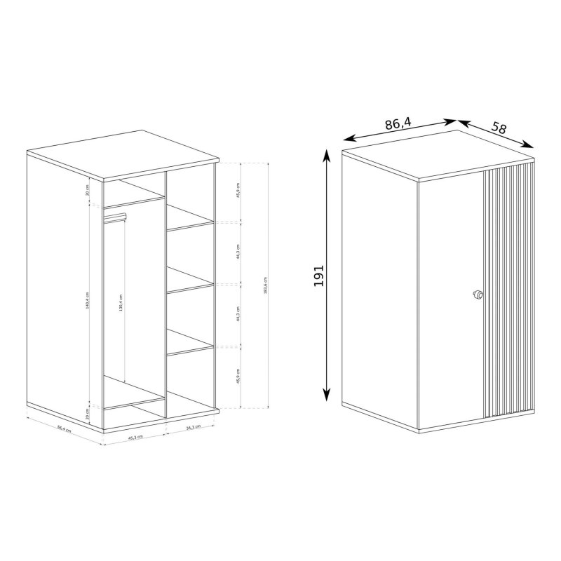 Duża i pojemna szafa z półkami oraz drążkiem na ubrania to praktyczny i stylowy mebel, który doskonale sprawdzi się w sypialni lub salonie. Dzięki funkcjonalnemu wnętrzu pomieści zarówno odzież wiszącą, jak i złożone ubrania czy dodatki.