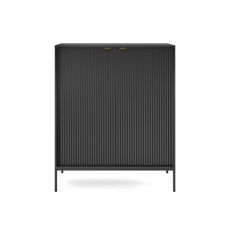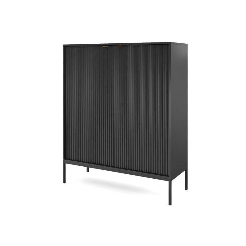 Nowoczesna wysoka komoda do salonu zachwyca elegancją i funkcjonalnością. Solidne materiały, złote uchwyty i smukłe metalowe nóżki nadają jej lekkości i stylu. Wnętrze z pojemnymi półkami sprawia, że ta ryflowana komoda idealnie porządkuje przestrzeń, a dzięki modnym kolorom – kaszmir, zieleń, szarość, czerń czy biel – z łatwością dopasujesz ją do wnętrz swojego domu lub mieszkania, gdzie sprawdzi się jako komoda z półkami do sypialni lub salonu.