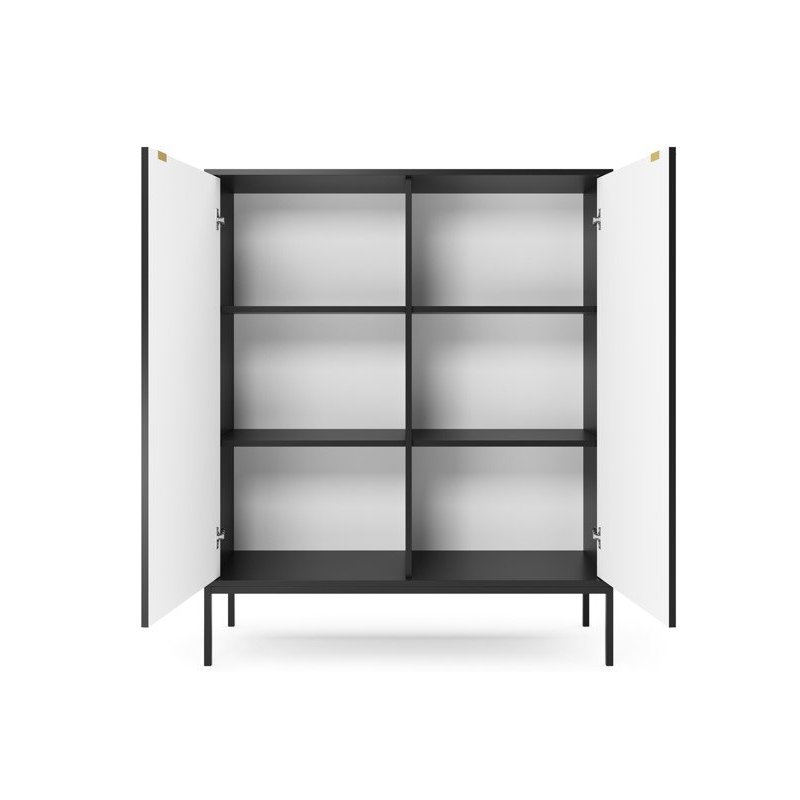 Precyzyjne wykonanie i użycie solidnych materiałów gwarantują trwałość na lata, a subtelne złote uchwyty w połączeniu ze smukłymi, metalowymi nogami dodają konstrukcji wyrafinowania. Ta wysoka komoda do salonu nie tylko przyciąga wzrok, ale także doskonale spełnia funkcję praktycznego miejsca do przechowywania. Dzięki starannemu wykończeniu każdy detal – od gładkich powierzchni po harmonijnie dobrane kolory – tworzy spójną całość, która dodaje wnętrzu wyjątkowego charakteru.