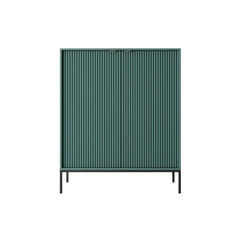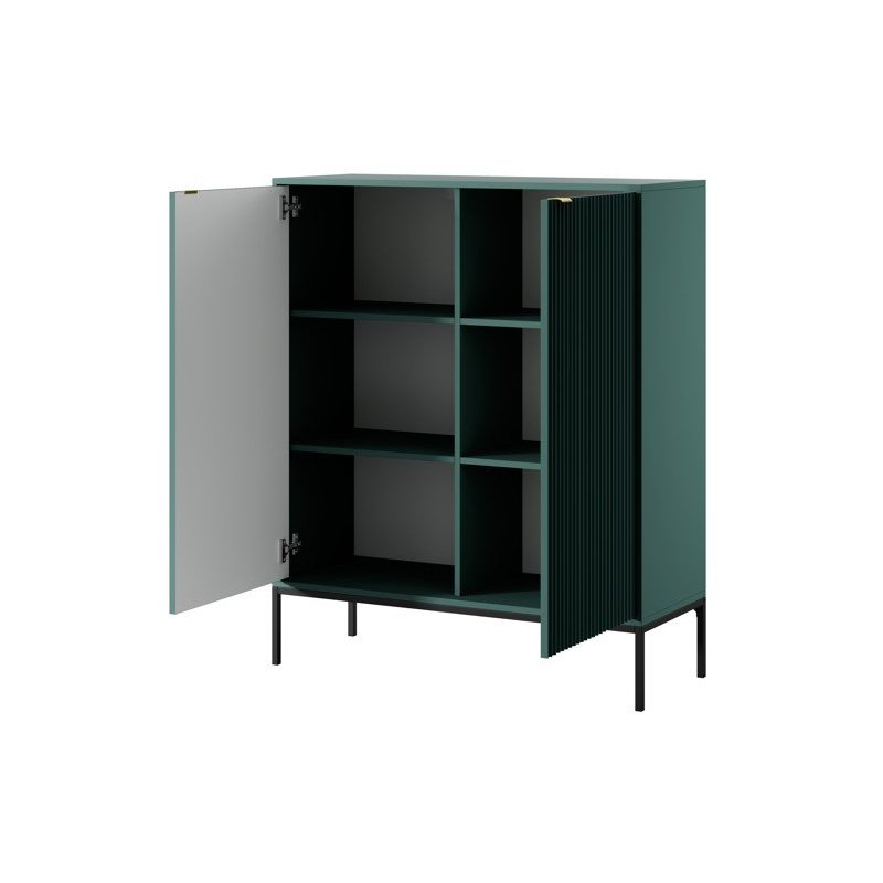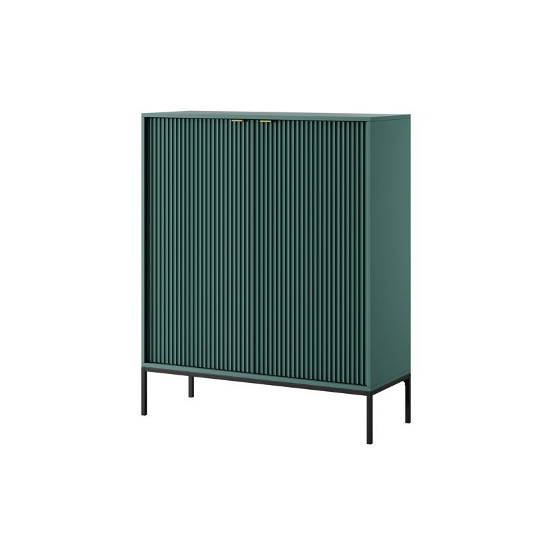 Nowoczesna wysoka komoda do salonu zachwyca elegancją i funkcjonalnością. Solidne materiały, złote uchwyty i smukłe metalowe nóżki nadają jej lekkości i stylu. Wnętrze z pojemnymi półkami sprawia, że ta ryflowana komoda idealnie porządkuje przestrzeń, a dzięki modnym kolorom – kaszmir, zieleń, szarość, czerń czy biel – z łatwością dopasujesz ją do wnętrz swojego domu lub mieszkania, gdzie sprawdzi się jako komoda z półkami do sypialni lub salonu