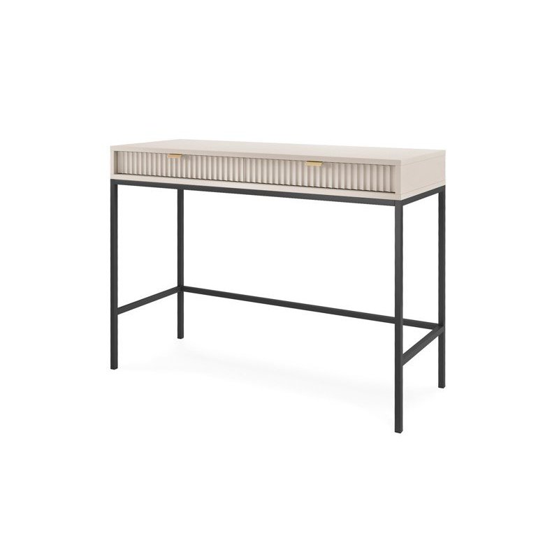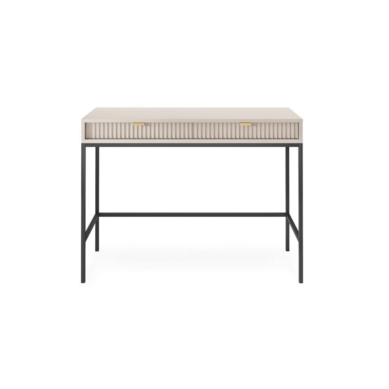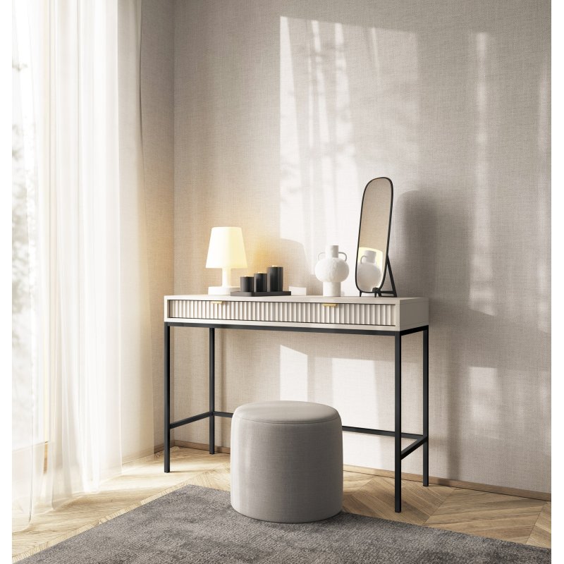 Nowoczesna toaletka do sypialni Cosmo to idealne połączenie stylu i wygody w codziennym użytkowaniu. Jej smukła forma oraz ryflowane fronty z delikatnymi, złotymi uchwytami dodają wnętrzu wyjątkowego charakteru. Szeroki blat zapewnia wygodną przestrzeń do przechowywania kosmetyków i akcesoriów. Dwie pojemne szuflady pozwalają utrzymać porządek, dzięki czemu wszystko masz zawsze pod ręką. Stabilna, metalowa konstrukcja sprawia, że mebel prezentuje się lekko i elegancko. To elegancka toaletka do sypialni, która wprowadzi do Twojego wnętrza nutę klasy i funkcjonalności.
