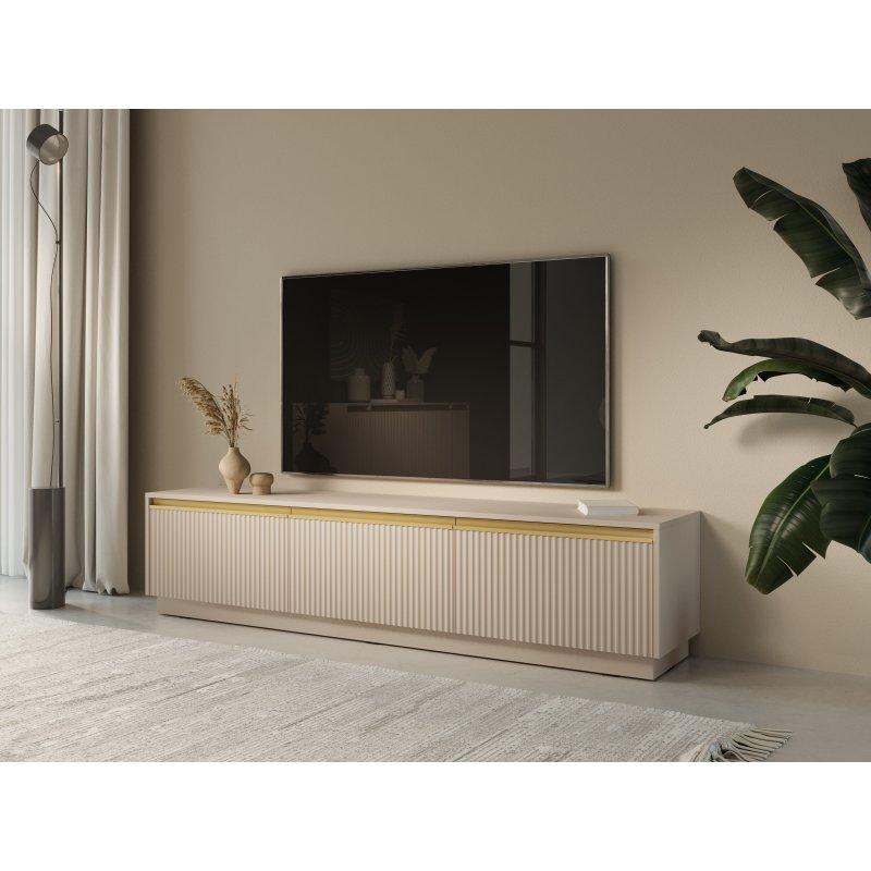 Złote detale w formie uchwytów ukrytych w podcięciach frontów wprowadzają nutę luksusu, czyniąc ten mebel wyjątkowym akcentem w każdym pomieszczeniu. Szafka pod telewizor nie tylko zachwyca wyglądem, ale też oferuje przemyślane rozwiązania użytkowe. Wyposażona w dwie pojemne szafki oraz praktyczną szufladę, pozwala zachować porządek i przechowywać wszelkie drobiazgi – od pilotów i kabli, po dokumenty czy płyty. Dzięki wymiarom 180x42x39 cm zapewnia optymalną przestrzeń na sprzęt RTV, a solidna konstrukcja gwarantuje stabilność i bezpieczeństwo użytkowania.
