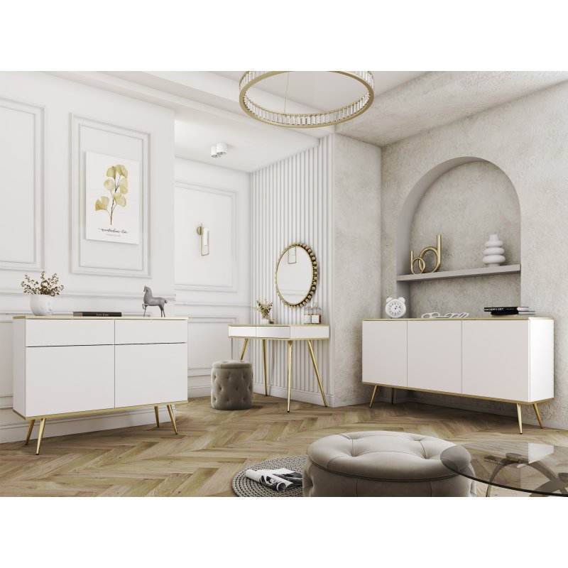 Ta kolekcja mebli to połączenie nowoczesnego designu z subtelnym stylem glamour. Świetnie sprawdzi się zarówno w sypialni, jak i w eleganckim salonie czy holu. Meble prezentują się lekko dzięki smukłym nogom i delikatnym liniom, a złote akcenty dodają wnętrzu prestiżu.