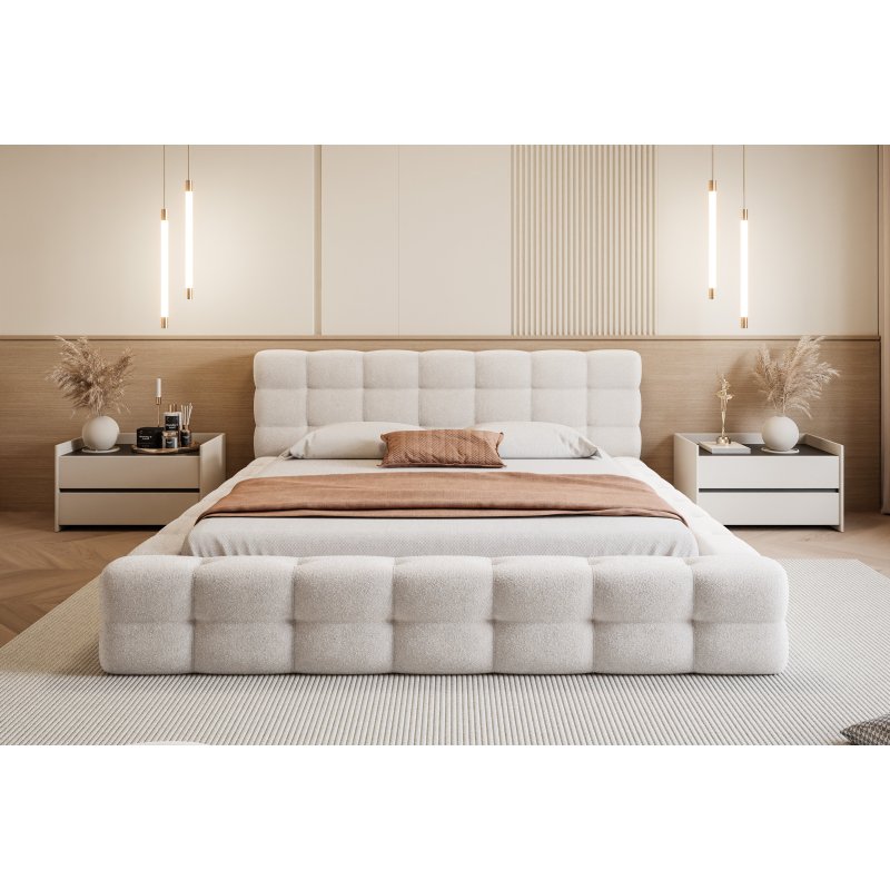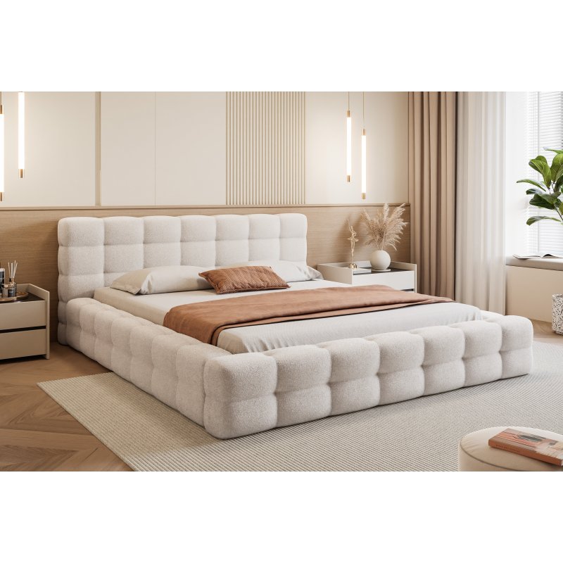 Łóżko AMAROS może zostać wykonane w wyjątkowej tkaninie o charakterystycznym splocie typu bouclé, przypominającym miękkiego baranka. Materiał ten nadaje meblowi niepowtarzalny wygląd, przytulność oraz elegancję.