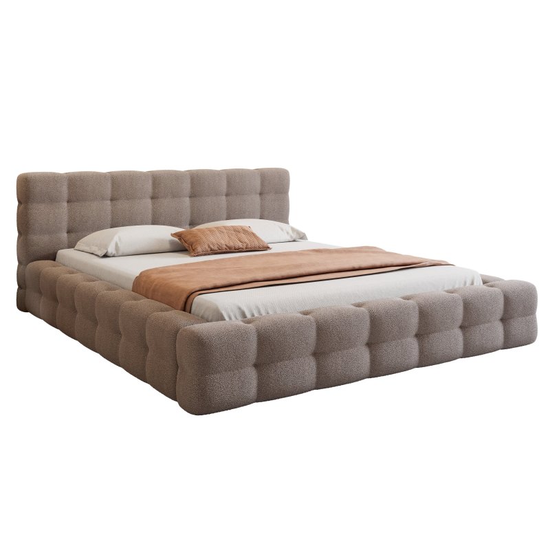 Łóżko AMAROS może zostać wykonane w wyjątkowej tkaninie o charakterystycznym splocie typu bouclé, przypominającym miękkiego baranka. Materiał ten nadaje meblowi niepowtarzalny wygląd, przytulność oraz elegancję.