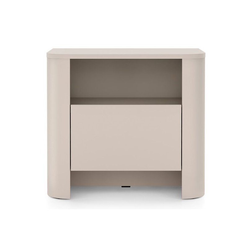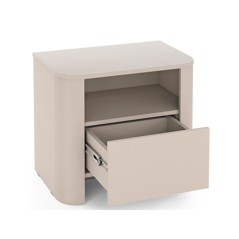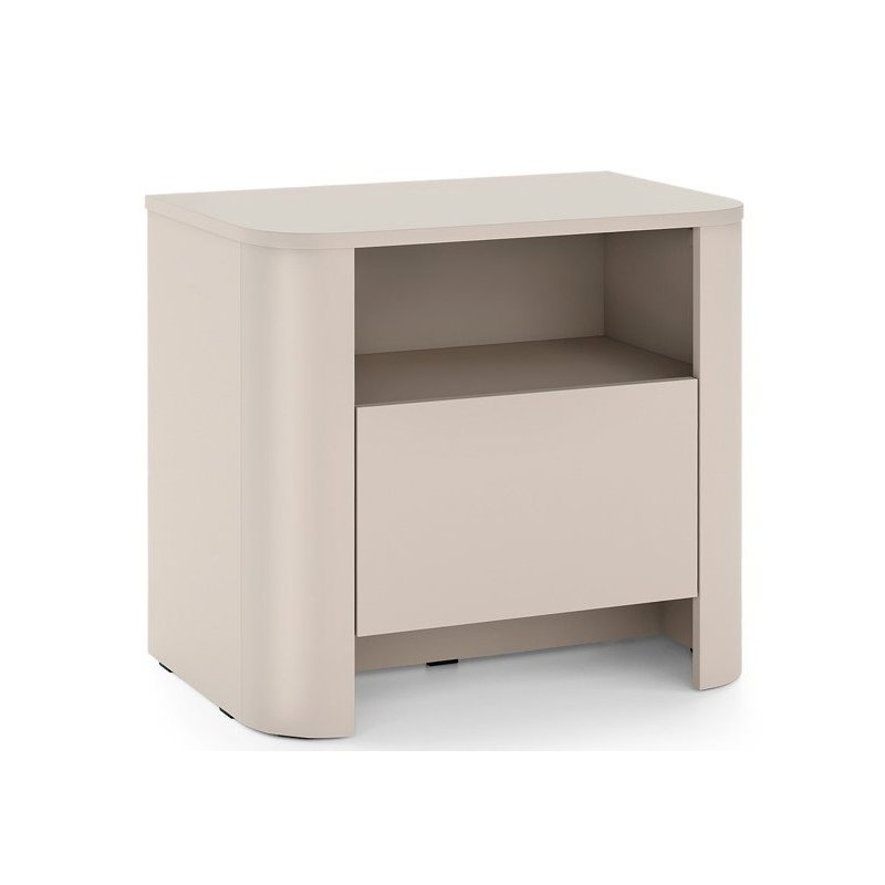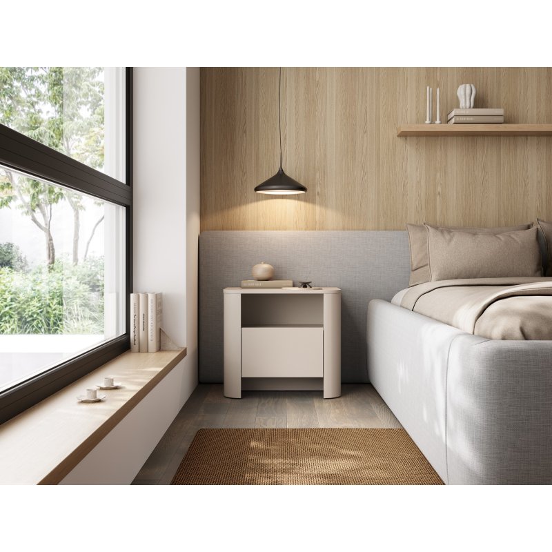 Kaszmirowy stolik nocny łączy nowoczesną formę z praktycznym układem. Otwarta półka i pojemna szuflada sprawiają, że kaszmirowa szafka nocna do sypialni jest idealna do przechowywania książek i drobiazgów. Zaokrąglone krawędzie i neutralny kolor kaszmiru wprowadzają do wnętrza przyjazną atmosferę, a trwałe materiały zapewniają długotrwałe użytkowanie.