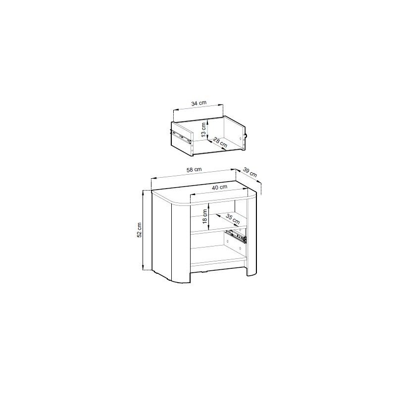 Solidne materiały, w tym płyta laminowana o wysokiej odporności, zapewniają trwałość i łatwość w utrzymaniu w czystości. Prowadnice szuflady gwarantują płynne i ciche otwieranie, co podkreśla wygodę użytkowania na co dzień. Konstrukcja jest stabilna, a jednocześnie prezentuje się lekko – dzięki delikatnie zaokrąglonym narożnikom mebel zyskuje łagodny, nowoczesny wygląd.