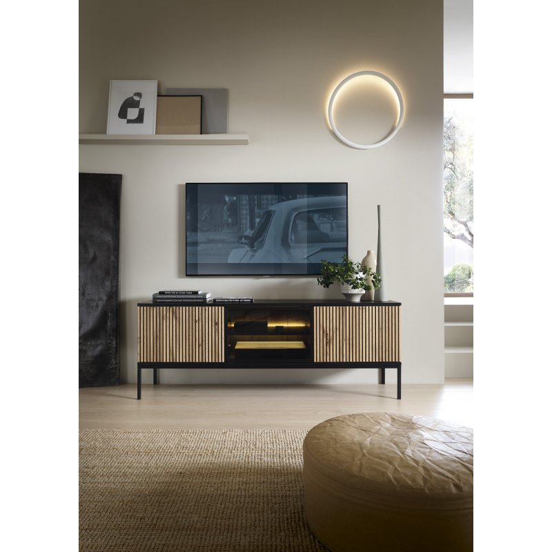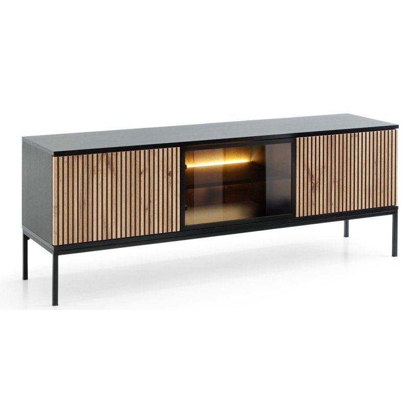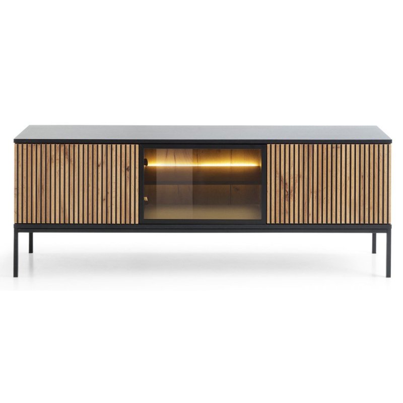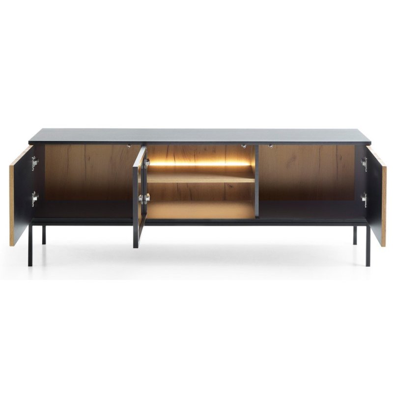 o salonu, meble nowoczesne, meble loftowe, meble dąb i czerń, jasne meble do salonu, zestaw mebli RTV, witryna z oświetleniem LED, komoda do salonu, szafka RTV nowoczesna, meble industrialne, aranżacja salonu, wyposażenie salonu