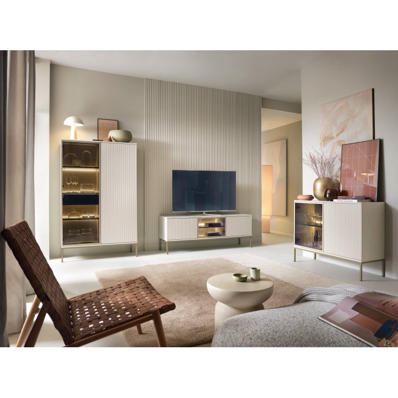 • Modułowość: dobierzesz witrynę, komodę i szafkę RTV tak, by dopasować zestaw do metrażu.